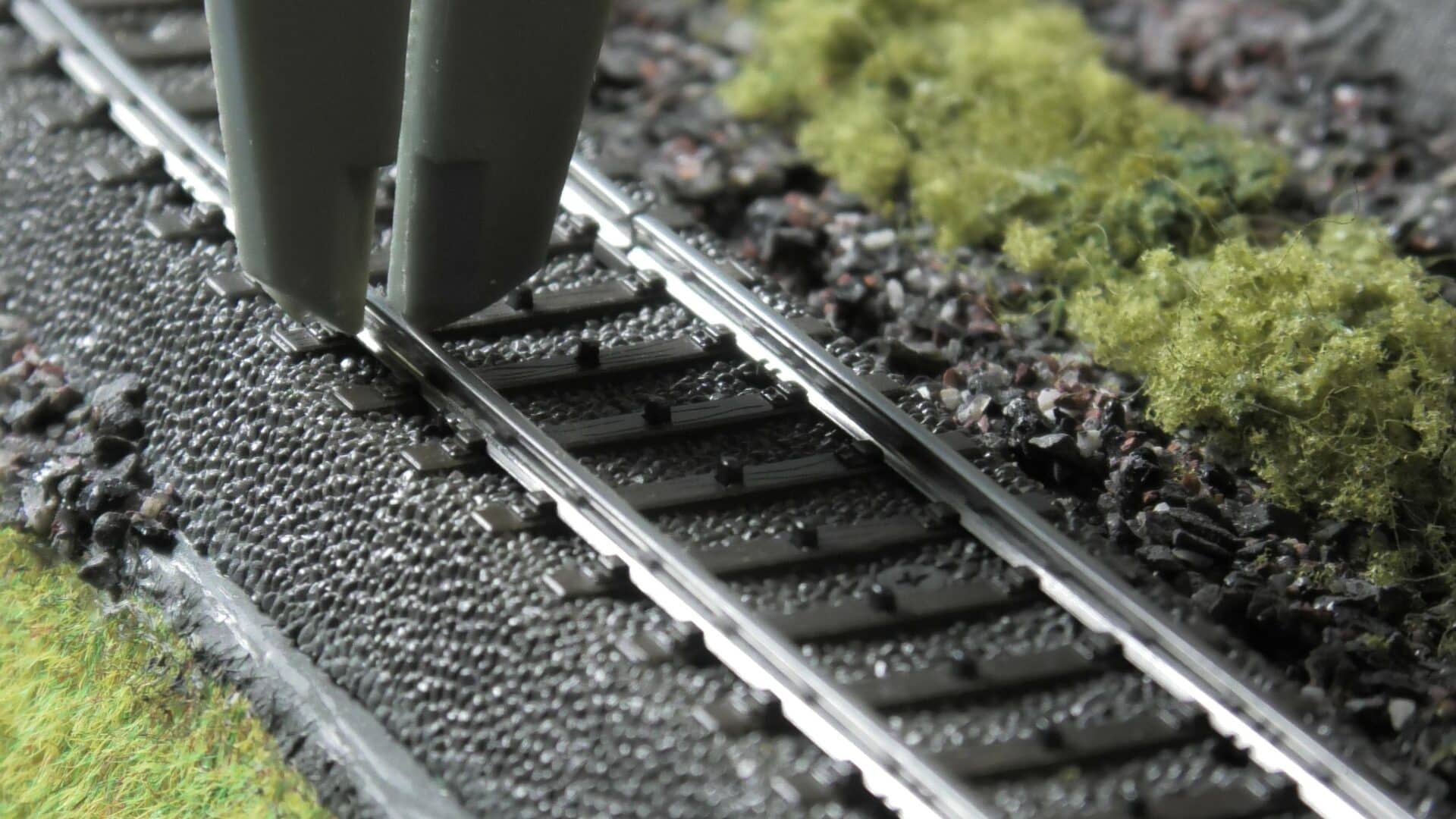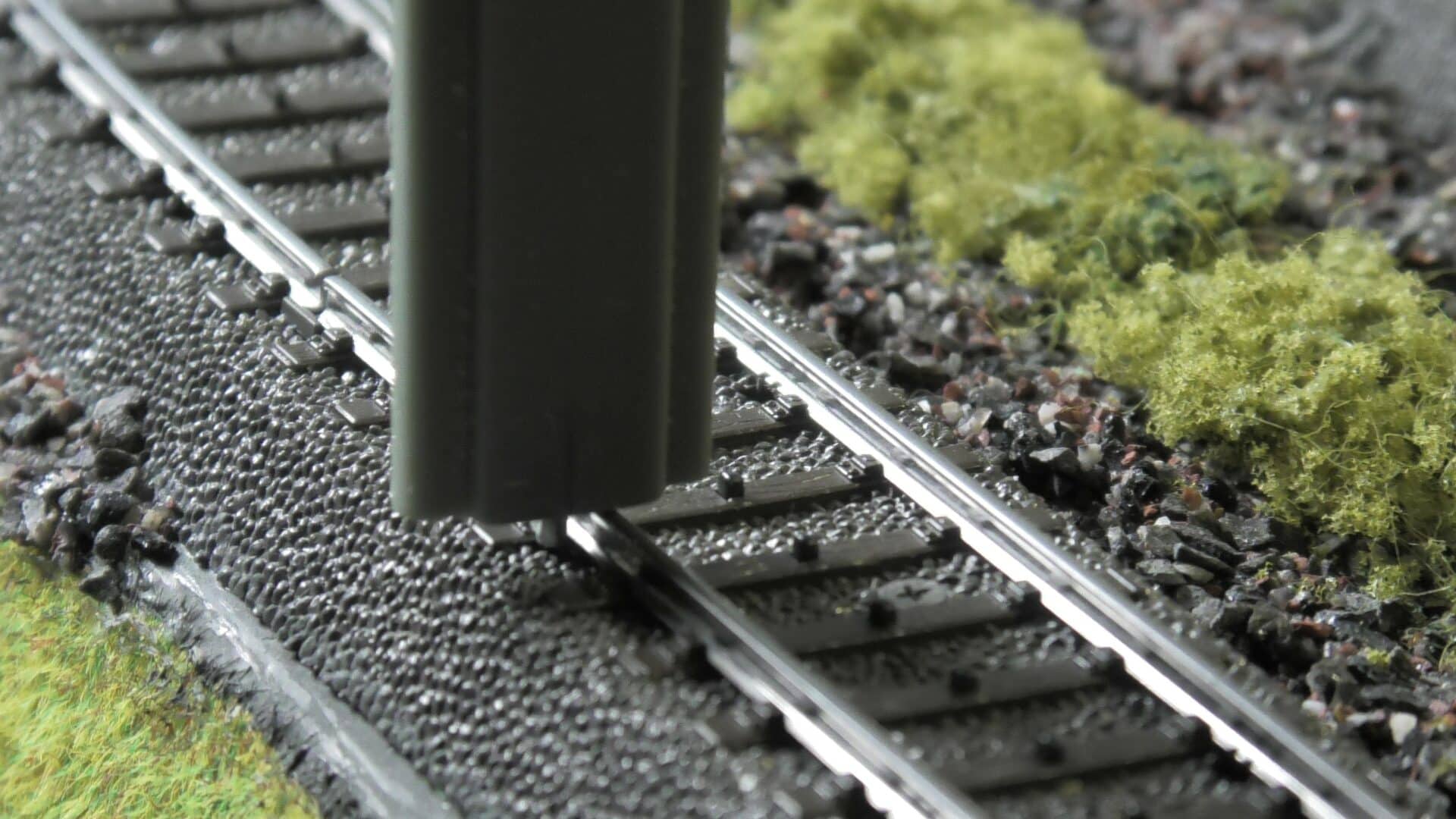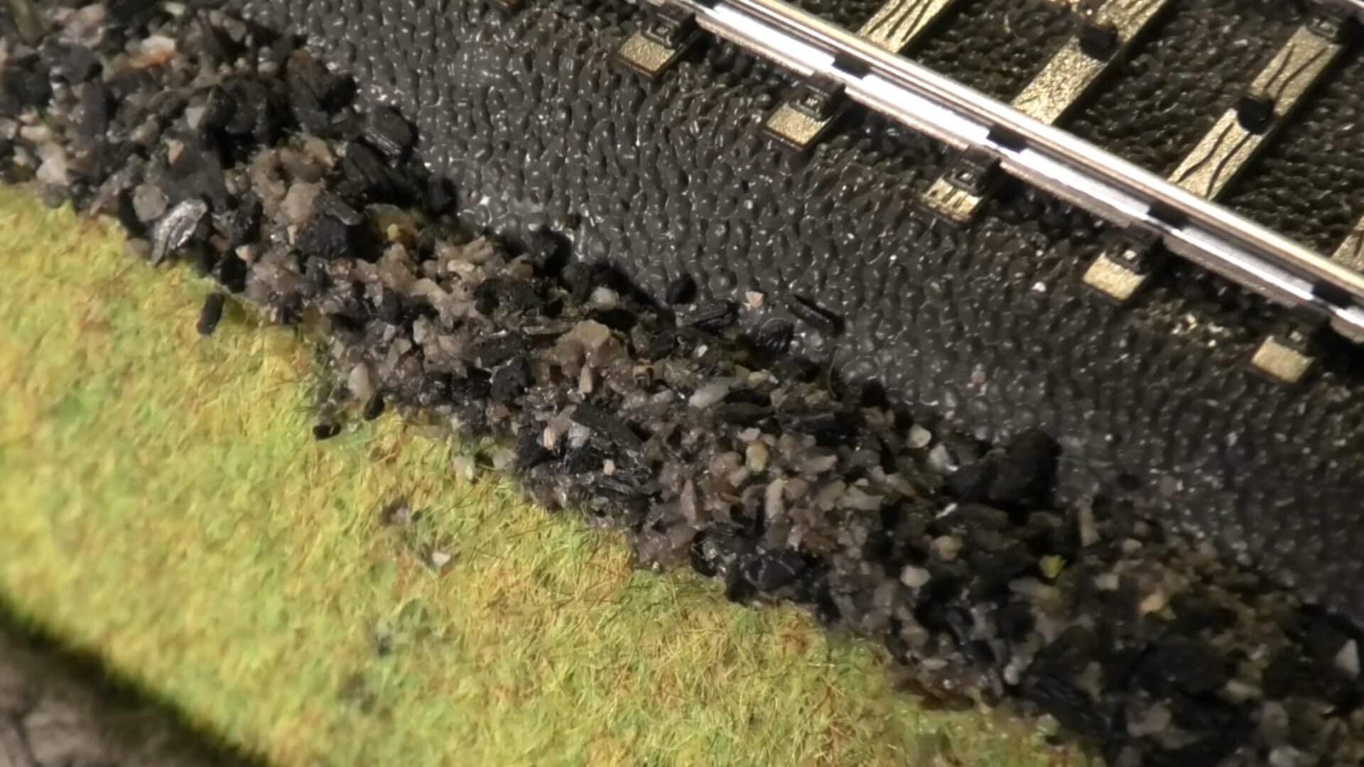 På min modelljärnväg är ballastkornen upp till 2 mm stora, vilket i verkligheten skulle motsvara stenbumlingar på närmare 20 cm. Det säger sig självt att detta ger ett oskaligt intryck. Jag planerar därför att lägga ut finare ballast längre fram.