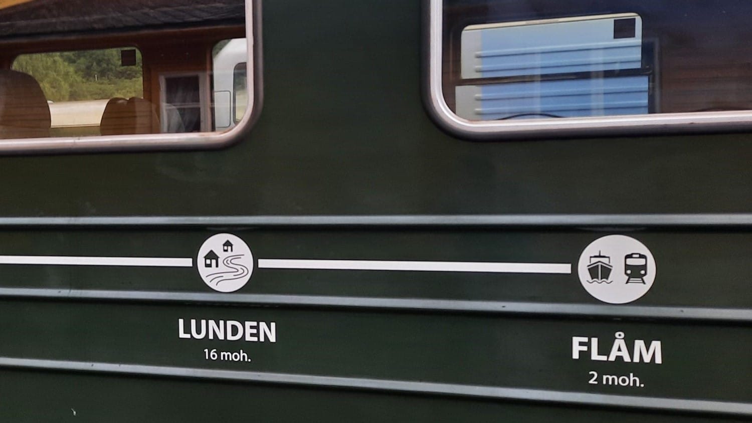 I min lilla lägenhet måste modelljärnvägens spårkurvor, av utrymmesskäl, vara snäva. Det ser dock tokigt ut när man kör med boggievagnar, som den här långa vagnen från Flåmsbanan. Jag köpte den i souvenirbutiken i Flåm efter att ha åkt i den verkliga vagnen. En lustig detalj är att mitt namn står på vagnens utsida – en av stationerna längs banan heter Lunden.