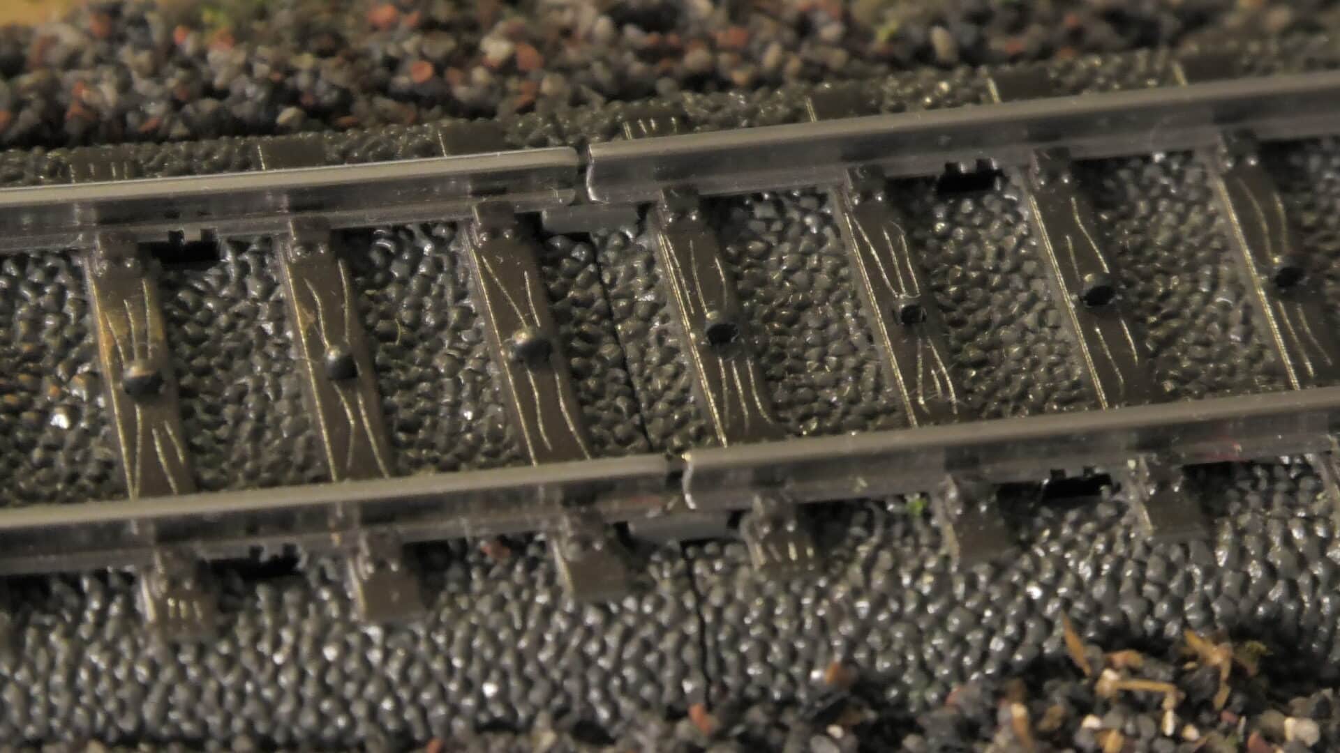 Skenskarvarna ligger alldeles för tätt, särskilt där jag har använt korta rälsbitar. Dessutom ligger de exakt mitt emot varandra på båda rälerna. I verkligheten ligger skarvarna normalt inte mitt för varandra, utan är förskjutna just för att undvika svaghet i samma tvärsnitt.