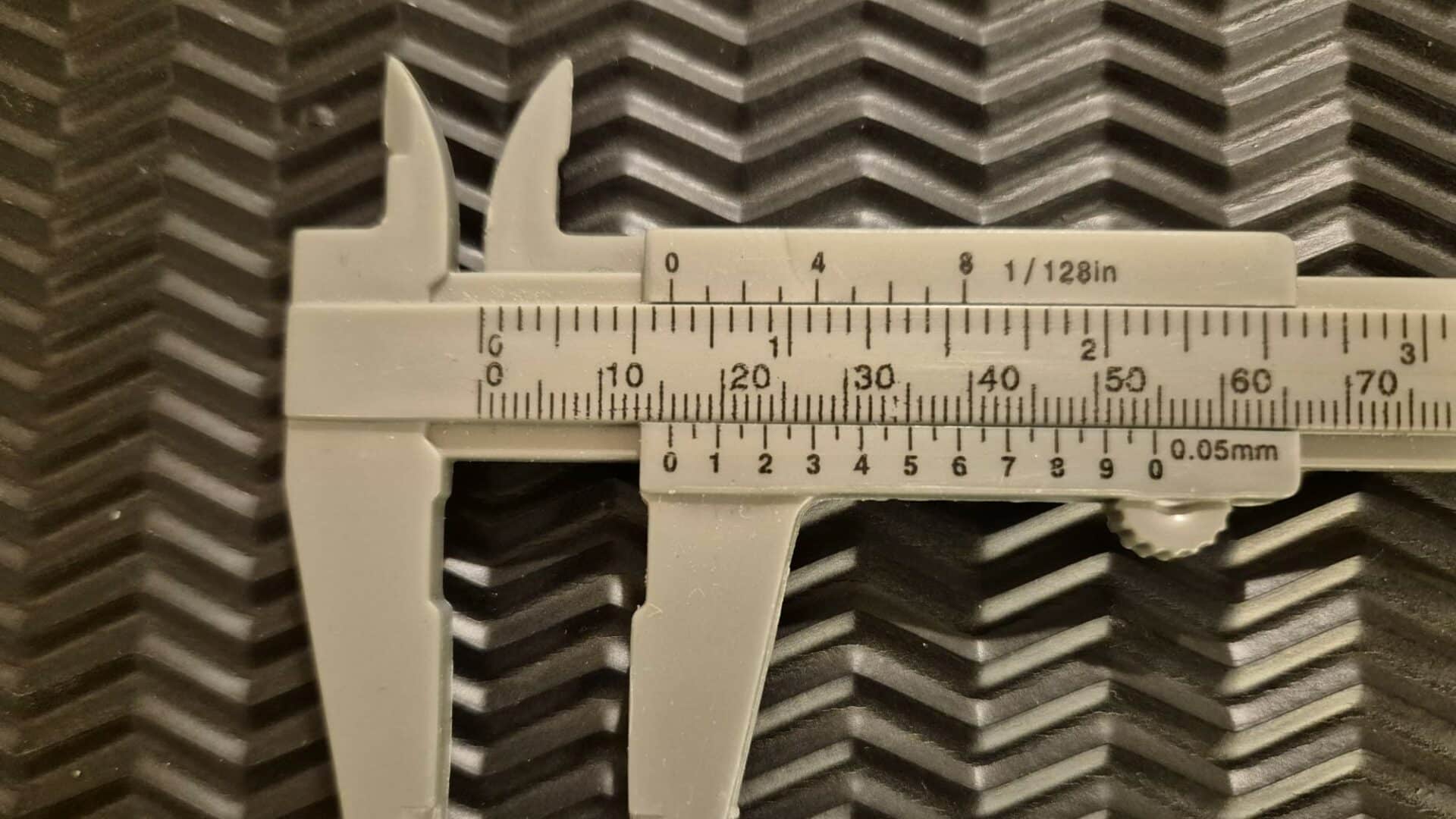 Det finns i dag digitala skjutmått för att mäta smått, men jag nöjer mig med ett enkelt skjutmått av plast. Det har nonieskala, som jag lärde mig att använda i min ungdom när jag praktiserade på Klingelnberg mekaniska verkstad i Tyskland. Med hjälp av nonieskalan kan man mäta med en noggrannhet på en tiondels millimeter.